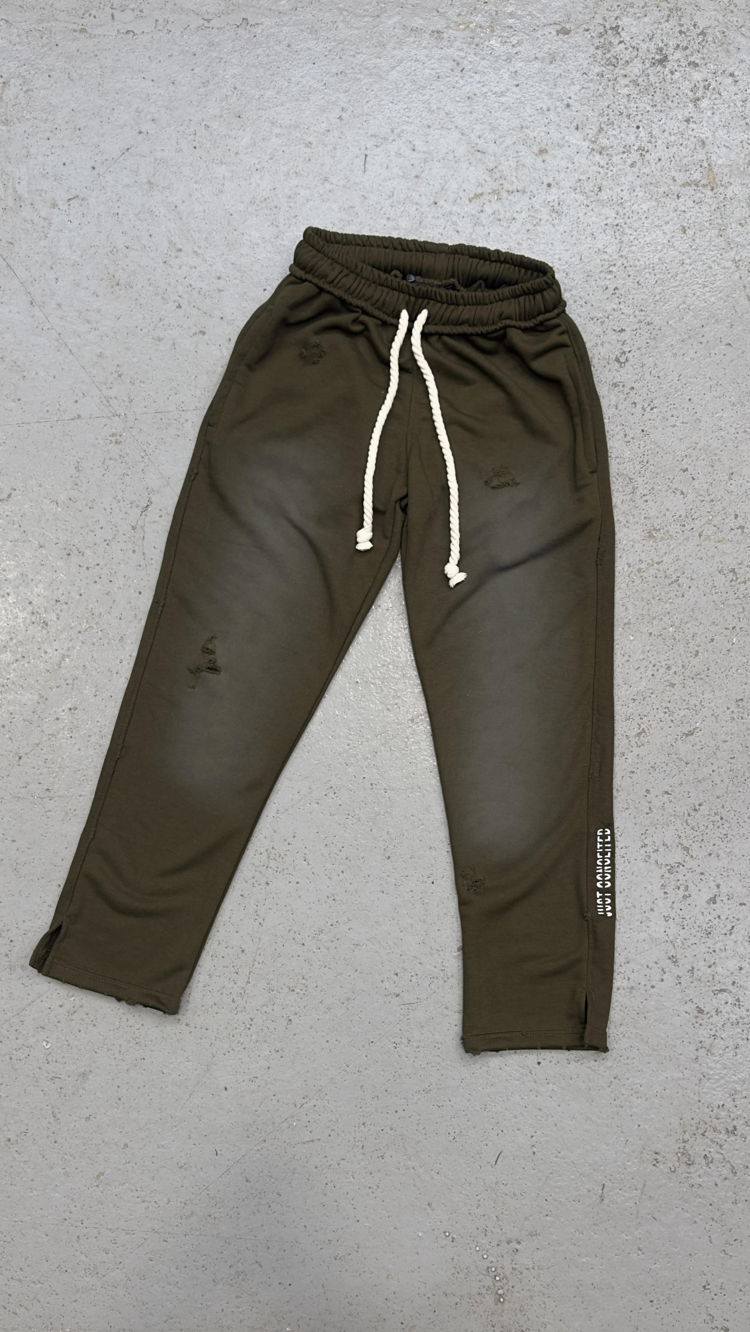 The pants feature purposeful distressing, with small abrasions adding a worn, rugged aesthetic.